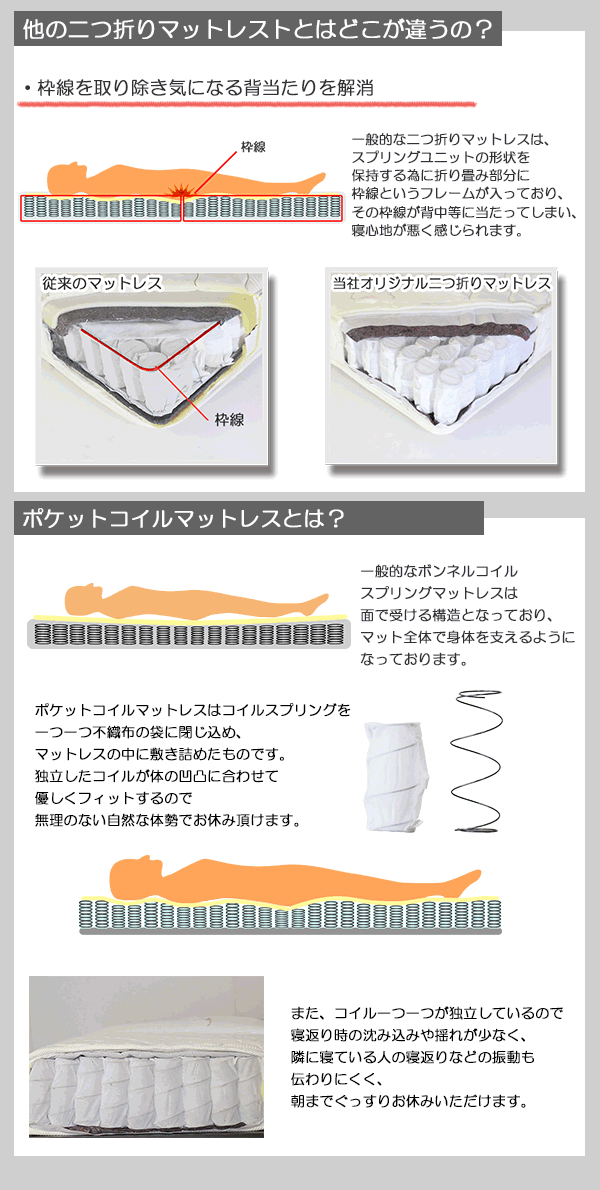 マットレスは、独立したコイルスプリングが荷重や振動を「点」で吸収!体圧分散性に優れた寝心地にこだわったマットレスです。